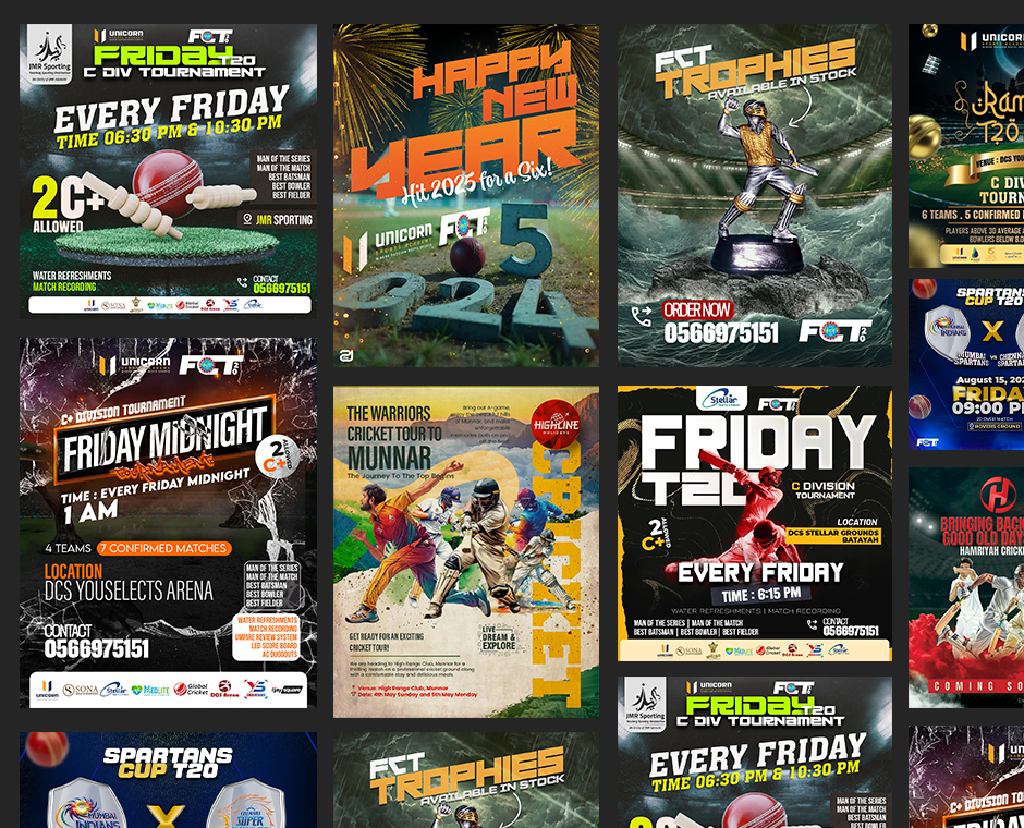 Our posters for FCT Cricket highlight bold design and powerful visuals, creating strong impressions that energize audiences and promote sporting events effectively.